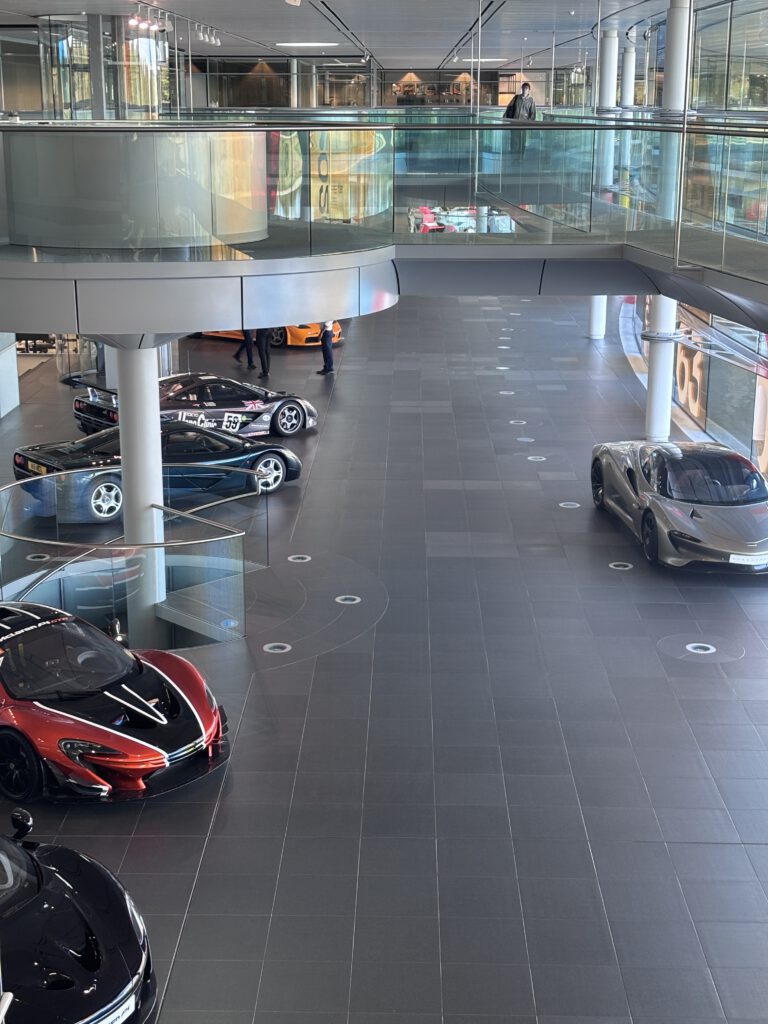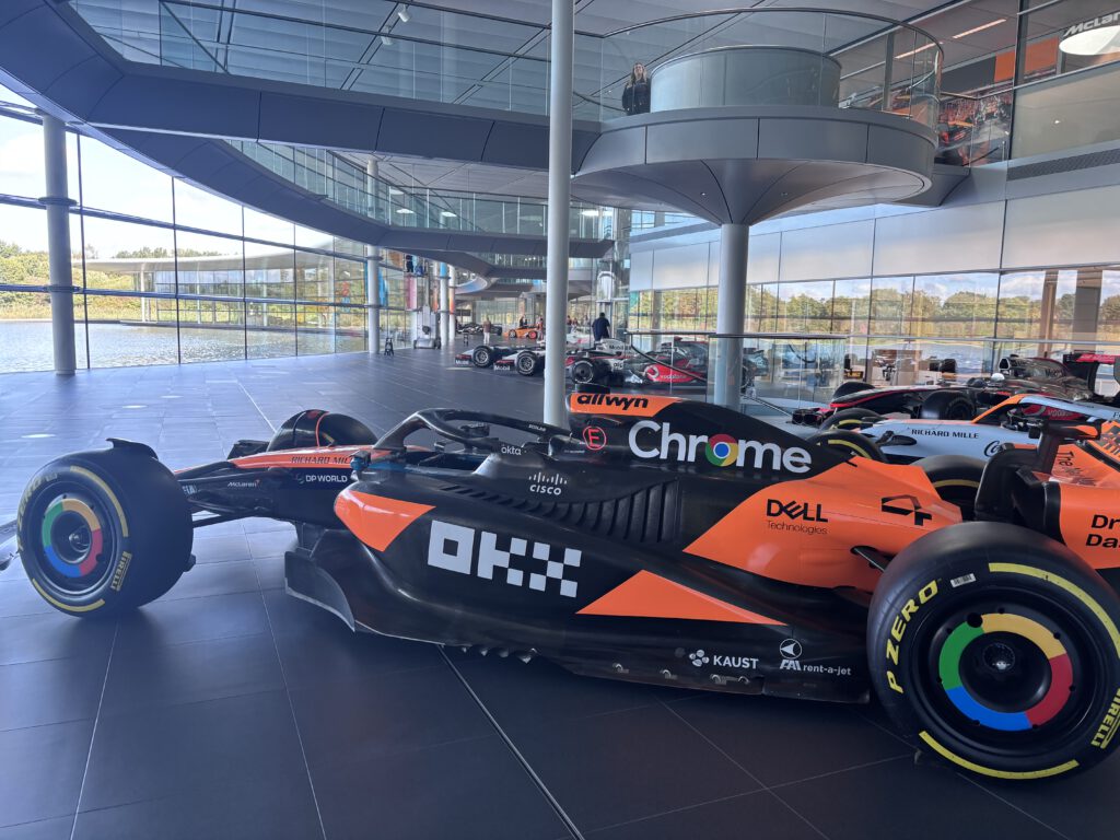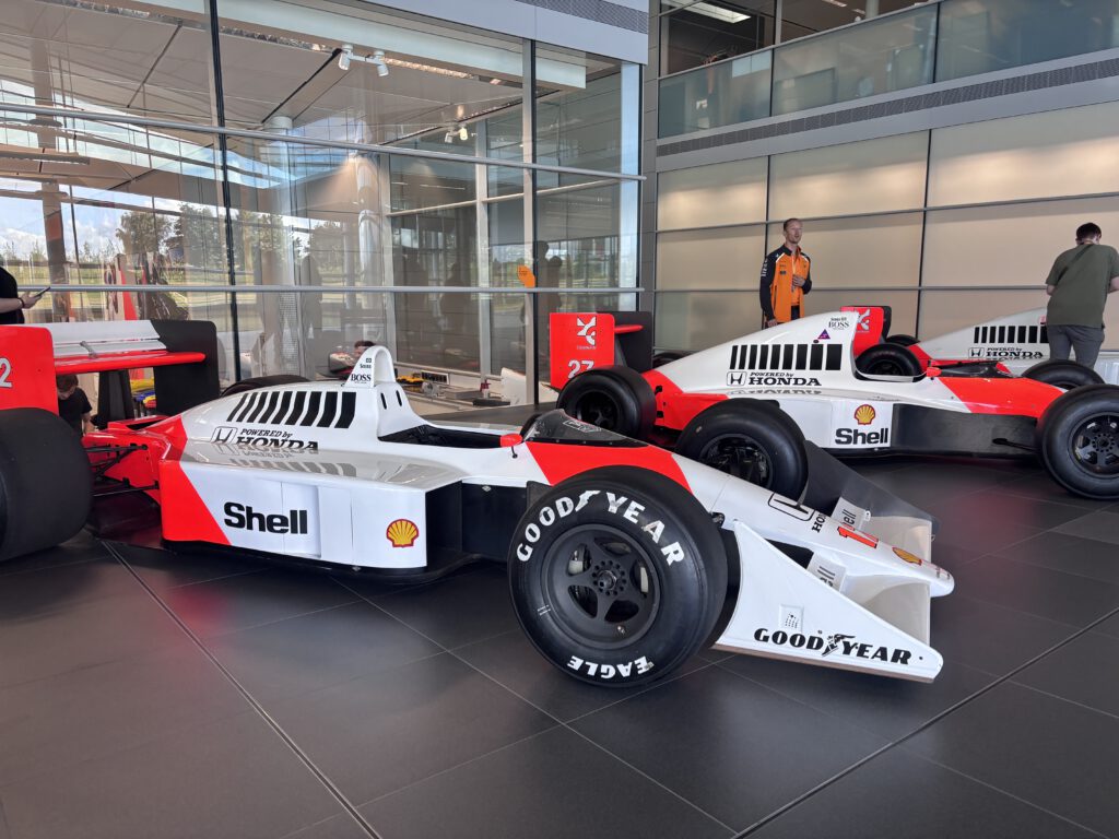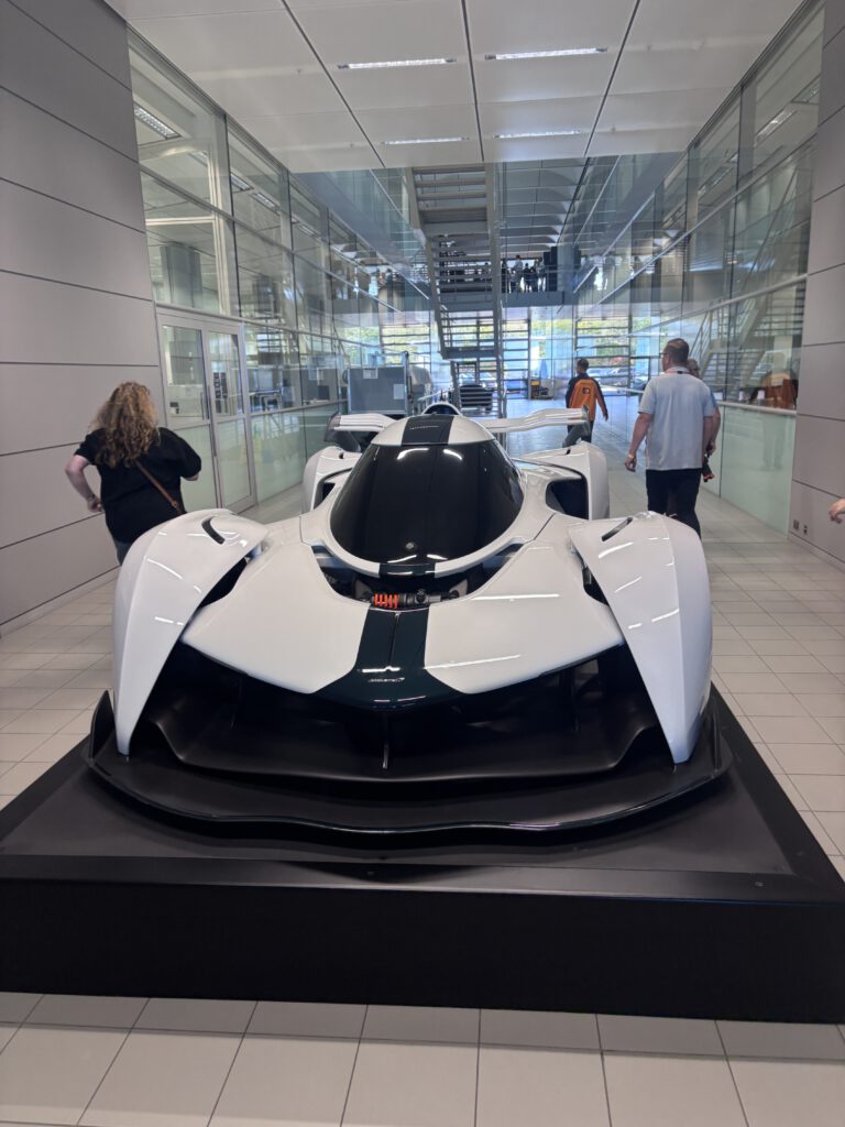 Monday morning we went to McLaren MTC. We had to go to a special parking place and a shuttle bus drove us to the VIP entrance. And yes it’s what they say when you drive down that road it’s like a big wow factor. The building is so impressive in it design. We had a photoshoot with last year car. And during out coffee break we saw Zak Brown entering the building. The place was impressive and amazing to see how they build the racing cars. To see alle the trophy’s and the factory where they build the street cars.  All the cars are made by hand. For me it was impressive and I saw how much my dad loves this place. It’s so impressive and big also with a gallery of old cars. Really a trip never to forget.